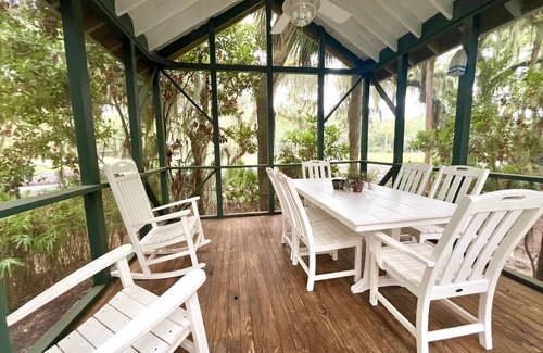 Guests fall in love with the unique outdoor space. A sunken deck with grill and outdoor seating overlooks the fairway of Ocean Winds. Stairs lead to an elevated and screened gazebo with a dining table and ample seating all overlooking the green. The property is surrounded by lush greenery and phenomenal golf course views, providing a tranquil setting for relaxation.