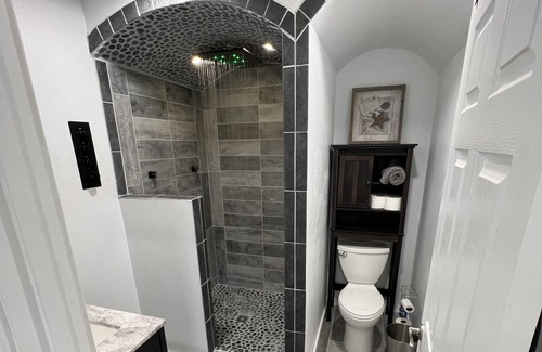 The bathroom has a beautiful custom built rainfall shower with heated rock path, tile floors and the surround sound extends into the bathroom so you can rock out to music while you shower!