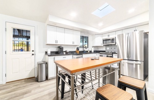 KITCHEN: The fully equipped kitchen is a chef's dream, with all the necessary appliances and tools to prepare delicious meals for your group. In the pantry, you will find a crockpot, blender, toaster, and more. A selection of teas, Keurig cups, and fresh coffee beans are available to welcome the day. If you prefer dining al fresco, there's also an outdoor grill and full dining table.