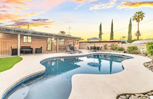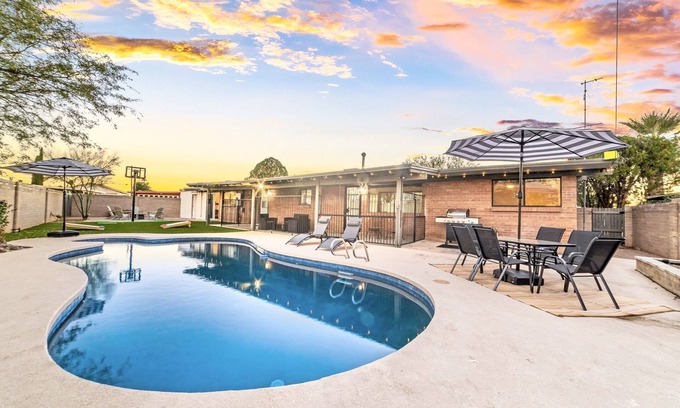 Welcome to our newly remodeled desert oasis in serene the Eastside of Tucson! This modern, spacious, and family-friendly 4 BD (7 beds plus a modular sleeper sectional), 2.5 BA, 2600 sq ft home offers a private pool, game room, and outdoor dining/living spaces. Inside, you'll find 2 large living areas, a well-equipped kitchen, and a dedicated office. Nestled in a quiet neighborhood with mountain views perfect for morning and sunset strolls, it's the perfect retreat for your group or family.