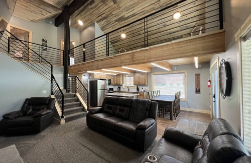 The kitchen is equipped with basic cooking utensils and supplies you'll need, along with dining space for the whole group. The main living area has a couple comfy couches, beautiful gas fireplace, and a smart screen TV. The back patio has a hot tub, grill, and extra seating where you can relax and hang out. The loft space upstairs has some extra furniture and is a great place for people to play games or lounge.