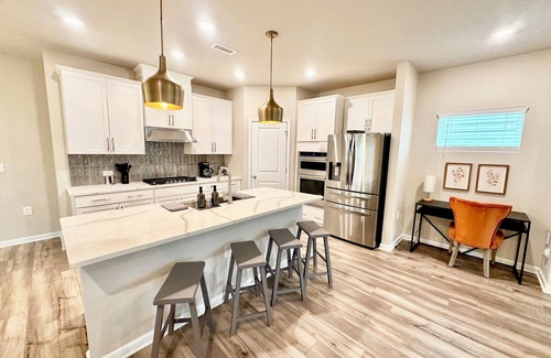 Newly built home with spread out open floor plan on main and second floor. New listing, more pics to come as we are finishing the design set up. See our profile for other designed homes and reviews. Taking pre bookings with discounts. Community pool opens in May. Ground floor bedroom with king bed and full bathroom. Additional bedrooms, and loft room with optional 2 twin beds or one king and add the den with pull out full size bed outside the primary bedroom. Total 7 beds