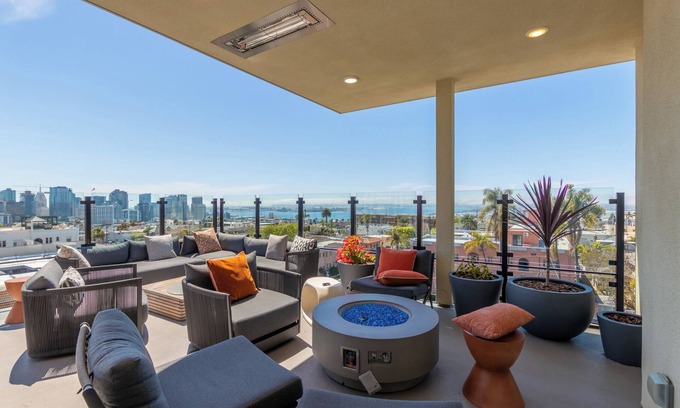✔ Rooftop Sky Lounge – Full views of the city skyline & bay with firepit & outdoor kitchen.