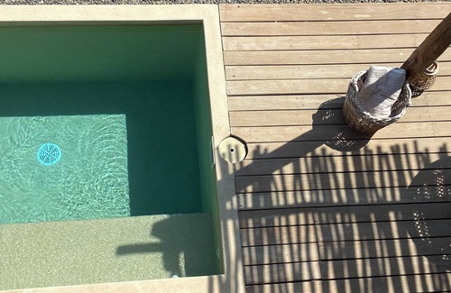 The bungalow has a king size bed with views of the pool and the sea and has a second square and a half bed that has been specially designed to work as a comfortable sofa bed. Full kitchen, living room, dining room also with sea view, large bathroom with outdoor hot shower and terrace with private pool. Direct access to the beach 400 meters away. High speed internet in the entire bungalow.
