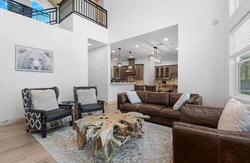 Step inside to discover a charming and luxurious interior, blending rustic warmth with modern amenities and furnishings. This home boasts 30' vaulted ceilings and the open-plan living and dining areas are ideal for gathering and provides a considerable amount of natural light from the floor to ceiling windows and cozy touches throughout. Whether you're enjoying a meal together or simply unwinding after a day of exploring, this cabin feels like a true home away from home. The unique, one of a kind floorplan includes a kitchen, dining room and living room downstairs and a full attached apartment upstairs with another kitchen, dining and living room including shuffleboard, a fire place and plenty of seating for those large groups.