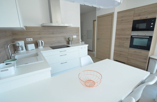 The kitchen includes an induction hob, oven, microwave, dishwasher, coffee maker, toaster, washing machine and all necessary utensils.