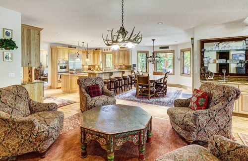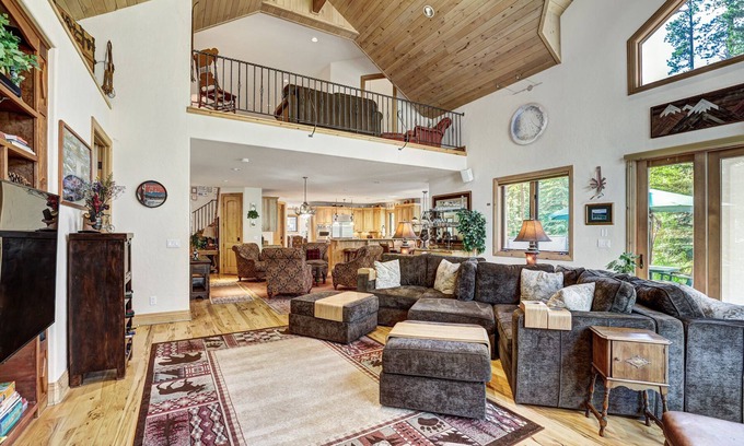 Living Room: Enter through the heated garage into the mudroom with full-size washer and dryer, utility sink, and boot & glove dryer to keep your gear ready. The open living area features soaring ceilings, natural sunlight, a plush sectional, two lounge chairs, and a large flatscreen TV with cable. A cozy gas fireplace with a stone mantel creates the perfect spot to unwind after a day on the slopes or trails.