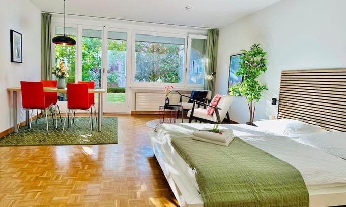 New, central studio with garden terrace and much privacy is a recently renovated apartment in Zurich, near Messe Zurich. Free Wifi is provided throughout the property and private parking is available on site. The accommodation provides an elevator and private check-in and check-out for guests. Providing a terrace with garden views, this apartment also provides guests with a flat-screen TV, a well-equipped kitchen with a dishwasher, an oven, and a microwave, as well as 1 bathroom with a bath and a hair dryer. The property has an outdoor dining area. A mini-market is available at the apartment. The apartment has a picnic area where you can spend the day outdoors. Swiss National Museum is 2.2 miles from the apartment, while Zurich Central Station is 2.3 miles away. Zurich Airport is 3.1 miles from the property.