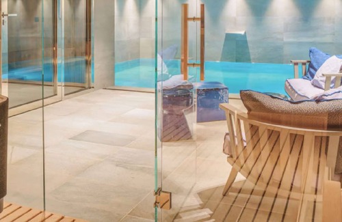 The lower floor of this ski chalet includes a wine cellar, a ski-room with ski boot warmers, a cozy home cinema with comfortable sofas, a home gym, and a wellness area featuring a swimming-pool with counter-current, hot tub and sauna; the perfect place to relax after a day of skiing.