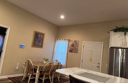 Newly constructed brick house has a huge sunroom, huge living room, 4 bed rooms, 2 extra beds in sun room attached bathrooms, walk-in closets. Waterproof flooring. Fully furnished. New Kitchen appliances. Pond access at your risk. Back and front porch with open air. parking space for 25 plus car. A good spot for a quick walk? Walmart 1.2 miles away. Only 5 minutes to down town. Perfect for a family of 12.