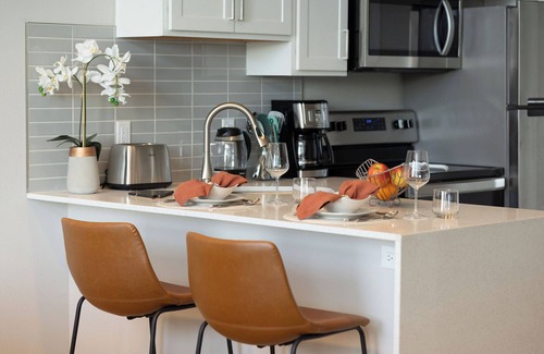Step into the thoughtfully designed space, where contemporary aesthetics meet comfort and convenience. The open and airy living area welcomes you with sleek and modern furnishings, with high ceilings, creating a harmonious blend of elegance, warmth and space. Sink into the new and plush Ethan Allen sofa or catch up on your favorite shows on the 55" flat-screen Apple TV (Netflix included).
