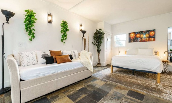 Our stylish studio provides just what you need for a nice relaxing getaway with a full kitchen, private patio, queen bed, two twin beds, and a magical backyard.