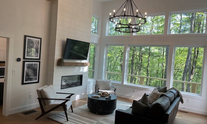 Brand new modern cabin near hiking, waterfalls, wineries, Helen, Dahlonega and Cleveland. Professionally decorated with high end furnishing make this the perfect home to escape to the mountains. 2 couples or family would find everything they would need only 2 hours from the heart of Atlanta. EV Level 2 Charger. Relax on the back deck and watch for wild life in the National Forest.STR-23-0073