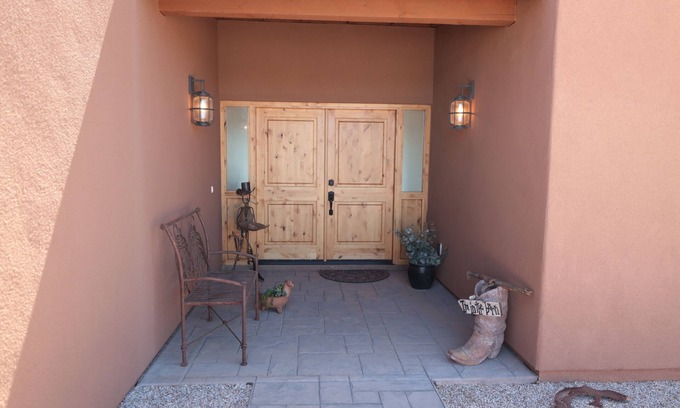 Historic wood barn door between bedroom and bath. Deep 700 square-foot half wrap porch facing your acreage and the city of Tucson. Perfect to watch the sunset and city lights. Patio table and chairs and an outdoor sofa, plus more. Barbeque grill. Fenced in backyard. The unique benefit of being away from the city but 5 min. to stores and other necessities. Best of both. Peace and quiet while you curl up to watch an unobstructed view of the sunset, and city lights. Come enjoy the solitude of the southwest desert and majestic views of our surrounding mountains.
