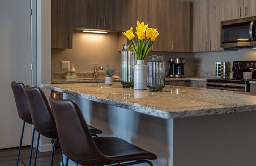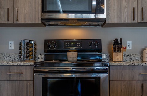 Have a few drinks in the living room while the food is getting ready. Once it's done, serve it on the adjacent counter with bar stools and enjoy a tasty meal with your loved ones and company. For corporate travelers this is the perfect atmosphere while in or around the area!