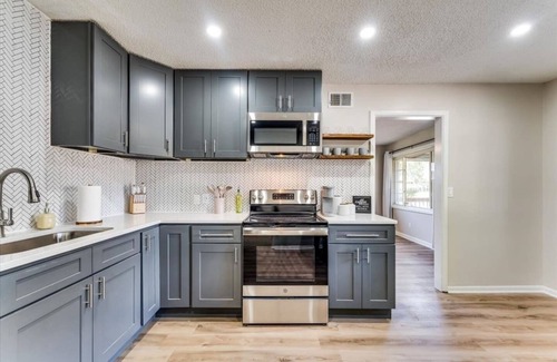 Large driveway for ample parking and a good size front porch! Open up the front door to a large living room with a smart TV with fast wifi & comfy couches. Updated kitchen with stainless appliances, brand new stocked kitchen with all your basics for cooking, and large dinner table. Both bedrooms have a queen bed with new mattresses, wireless phone chargers & large closets. Bathroom is also brand new features a towel warmer, hair dryer and squeaky clean shower! We also have a bonus room that has laundry access, a foosball table and futon. Enjoy our huge backyard with back patio as well.