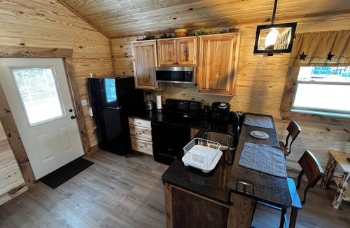Couples searching for a romantic escape will adore our newly constructed one-bedroom log cabin. The open floor plan includes a majestic stone fireplace, a queen-size log bed with a luxurious foam mattress, a full kitchen with all major appliances, and a spacious full bathroom. French doors in the cabin allow you to wake up to breathtaking mountain views right from your bed.