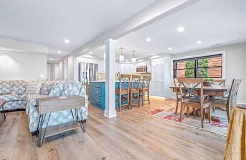 Main Floor: The main floor is down a flight of stairs from the front hall. This floor has a bedroom with a queen-sized bed and a full bath with a bathtub and shower. The full kitchen has a new microwave, gas range with a double oven, refrigerator, dishwasher, toaster, and Keurig. The kitchen has a beautiful island with a white quartz countertop that seats three. The kitchen sink has a faucet, garbage disposal, and a reverse osmosis faucet for crystal-clear drinking water. The kitchen table seats eight. Near the kitchen is a sitting room with a large screen smart TV hung over the natural gas fireplace. Spectrum Cable TV and Internet are provided, and guests may watch whatever subscription service they already have on the TV. A laundry room with a new high-capacity washer and dryer is off the hallway from the sitting room.