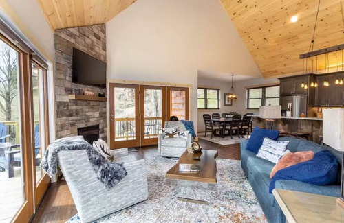 Stone Creek Cabin is a custom-built, upscale mountain-modern creekside home with 4BRs and 3.5BAs. This quiet mountain community is minutes from downtown Boone, Valle Crucis, and the Watauga River. Thoughtfully designed by the builder and the owners, Stone Creek Cabin has been furnished, outfitted, and equipped to be the ideal family-friendly mountain vacation destination. Amenities include a Hot Tub, Pool Table, Fire Pit, HD Smart TVs, Central Heat and AC, High-Speed WiFi Internet, and a Fireplace. This 2-acre property is in a large flat meadow with a bold creek with valley views, an idyllic getaway where guests can bring their provisions and never have to leave. Even the family dog can come along (restrictions and pet fees apply).