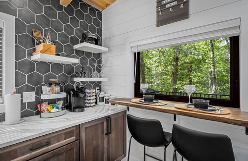 While outside, you will love the stunning wooded view of a ridge with a stream surrounded by mature trees while soaking in the hot tub. Use the propane grill for BBQing or enjoy s’mores at the fire pit with our complimentary firewood on-site. S’more kits are provided and are a must for every campfire.