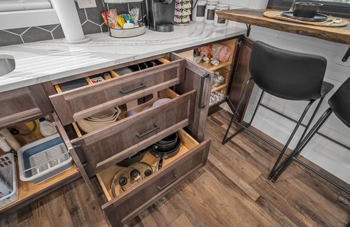 Upon entry into our treehouse, you will enjoy natural sunlight that peaks through the large picture window. The kitchen, living and bedroom areas are all open spaces that flow together seamlessly with plenty of places to sit and relax. The kitchen is stocked for your cooking needs in addition to a Keurig for your morning coffee, tea or hot chocolate. Enjoy puzzles, games or books for relaxing days. On cold evenings, grab a blanket and snuggle in front of a floor-to-ceiling stone fireplace. The laundry room is available for your use.