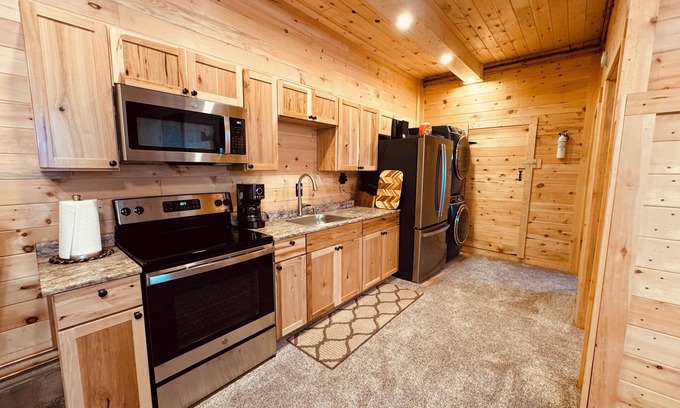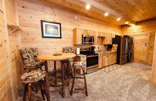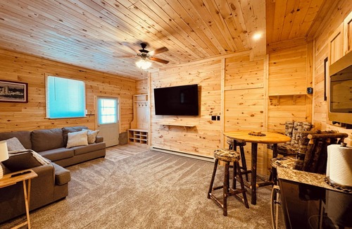 Brand new knotty pine one-bedroom open concept apartment close to Sault Ste Marie with custom-built Amish cabinetry throughout. Queen bedroom with built-in storage. Spacious bathroom with custom-built vanity and storage. Brand new appliances including: oven, microwave, refrigerator with ice maker, and stackable HE washer and dryer. Hickory cabinets and brand-new furniture. Many custom finishes. Zero entry. WiFi and smart TV. Ample parking. Immerse yourself in the charm of this country property close to town. Whether you're here for business or pleasure, our place is the ideal home away from home. This property is located on our family farm. We look forward to welcoming you!