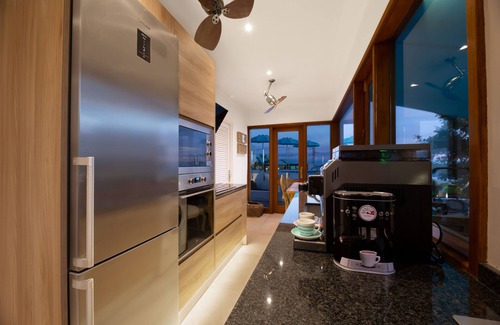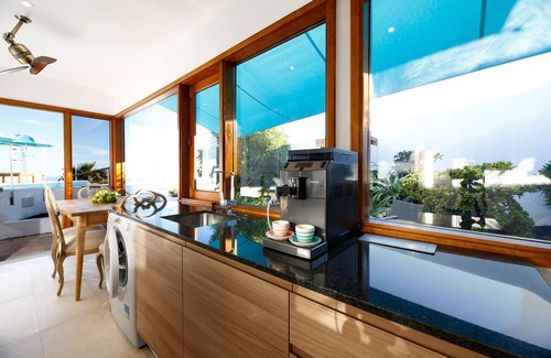 The "Le chefs" fitted kitchen is designed with large picture windows, lush garden/pool, and sea views, with complete fully equipped quality equipment for your creative cuisine dining experience. It includes an Italian semi-professional fully automatic coffee machine for your instant lattes and expressos with a "one-touch" operation and supplied with a full hopper of 100% high roast Arabica coffee beans.