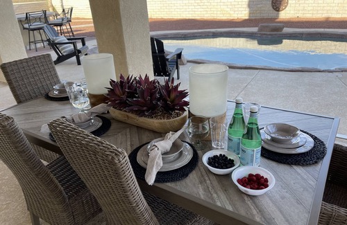 Welcome to our Desert Oasis. We have the perfect spot for you!! Enjoy a day at the lake, an afternoon on a Razor or a night at the casino our home is the spot to enjoy the beauty of Arizona desert. Enjoy Netflix on 80in TV or lounge in the volleyball pool(3.5 sides/5ft middle). BBQ and dine under covered patio. Friendly neighborhood. Quiet hours: 10pm-7am.