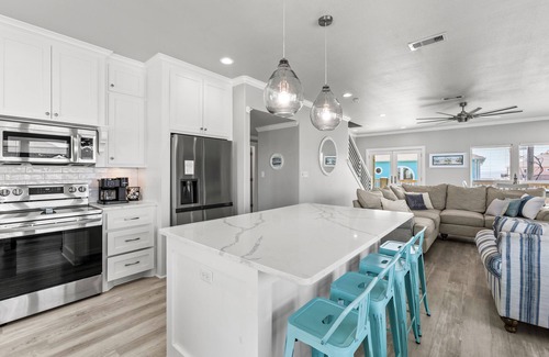 The open-concept kitchen is fully stocked with everything you need, whether you're preparing a simple beach picnic or a full holiday meal. Modern appliances, generous counter space, and a dining area perfect for gathering make mealtime a breeze.
