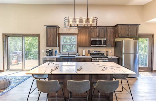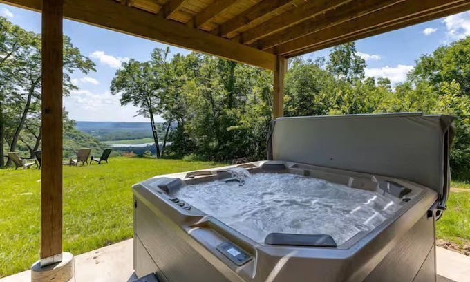 Welcome to your perfect getaway perched atop the bluffs with panoramic views of the mighty Mississippi River. This spacious 3-bedroom, 2-bathroom retreat blends comfort, entertainment, and natural beauty into an unforgettable stay. Whether you're seeking a romantic escape, family vacation, or weekend with friends, this blufftop haven offers the perfect balance of style, comfort, and fun—all set against the stunning backdrop of the Mississippi River. Hosted with Love, Rentals Justin Time Inside, you’ll find a thoughtfully curated interior that exudes rustic charm and comfort. Tastefully decorated with nature-inspired touches—each space creates a warm, inviting atmosphere that reflects the beauty of the surrounding landscape. Large patio doors flood the open-concept living area with natural light and frame stunning views of the river below. The fully equipped kitchen and dining area are ideal for preparing and sharing meals with family or friends. Or use the large dining space on the large deck space to enjoy group meals while taking in the spectacular views. Each of the three bedrooms is uniquely styled with comfortable bedding and calming tones, offering peaceful retreats after a day of adventure. The two full bathrooms feature modern fixtures and plenty of space to refresh and unwind. Step outside to your private bluffside deck or patio and take in the sweeping river views from the hot tub—perfect for morning coffee or evening relaxation. After sunset, gather around the outdoor fire pit or head inside to enjoy the dedicated game room, stocked with classic arcade games for all ages.