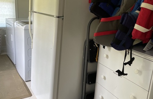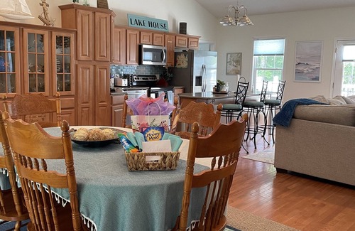 The main level offers a large great room that includes the large family room, kitchen and dining area where you can visit with your friends and family in comfort. Enough seating indoors and outdoor for all 17 at meals. The great room has a cathedral ceiling, ceiling fans, recessed lights and french doors that lead out to the deck with a lovely view of the lake. The kitchen has a large island with a wet bar sink and 3 chair back bar stools. The kitchen is well equipped for all of your cooking, baking and entertaining needs. There are pots and pans of every size, multiple platters and serving bowls, and more than 30 place settings of dishes, glassware and utensils. Just about every piece of cooking equipment you may need. The dining area seats 8+ at the main table, plus an additional table that accommodates 4 , and a folding buffet table that seats 8 and don’t forget the 3bar stools along the kitchen island. The family area on this level has a sectional and chairs. A set of French doors open onto the deck, where there is also enough seating(put tables together)on the deck for everyone to enjoy dinner and watch the beautiful sunsets. Don’t forget to open the solar umbrellas at night for beautiful lights to enjoy. There is also a gas grill for cooking the fish you catch or barbecuing. The primary bedroom has French doors that open onto the deck and has a great view of the lake from the king size bed. It also contains a 32” smart tv and a walk in closet. The primary has on suite bath has a jetted tub and a separate shower. Another bedroom(queen) on this level has french doors to the deck with a beautiful view of the lake and a 32" TV/roku blue ray. The 3rd bedroom(queen) has 24" TV and dvd player and walk in closet. The rest of the first floor includes a checkers corner, one additional full bath and large utility room with washer and dryer & 2nd refrigerator/freezer complete this level. The lower level offers game room with ping pong, shuffle board, a poker table, darts, full-size game another large living area with 'comfy' seating, ceiling fans and 2 tables with chairs to enjoy board games, puzzles or card games. There is a 39" HD flat screen tv/dvd/, video games, a chest full of games(There are to many games to fit in the chest so some are located in bedroom closets), puzzles, playing cards and lots of books and magazines(If you don’t finish that book on your vacation feel free to take it with you!) A set of french doors open up to the patio area with additional seating areas with metal roofing to under side of deck to hang out and when it is raining and easy access to the pool. There is a “bonus” room located at the end of the hall of the living area that has a set of bunk beds, ceiling fan and a small tv that we call Dory’s room. Three more bedrooms (queen), two bedrooms with French doors that open onto the patio and two full baths complete the lower level.