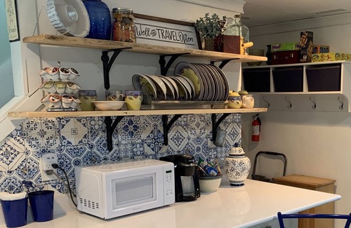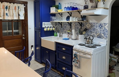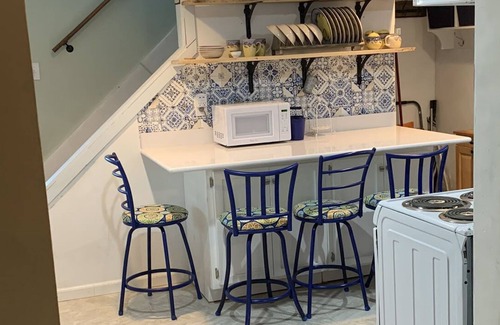 The eat-in kitchen has seating for four around a kitchen peninsula, and a small dining table for two. I fully equipped the kitchen with supplies for a satisfying meal after a long day or a delicious breakfast to start your adventure. It has a farmhouse style sink with a touchless faucet. The house is on well water, so there is bottled water stocked in the refrigerator for drinking. Due to previous issues with the water, we now have a new how hot water heater and filter as of early January 2020 and have passed all water inspections. It still is an old house, so it's like home, not a hotel.