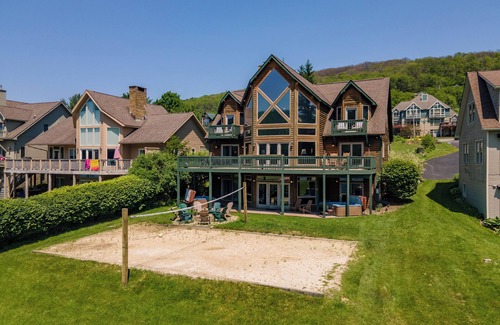 Welcome to Grandview Lodge, a luxurious lakefront retreat nestled along the serene shores of Deep Creek Lake. Designed for unforgettable getaways, this beautifully crafted home combines rustic elegance with modern comfort, all set against the backdrop of stunning water and mountain views. From the moment you arrive, you’ll be captivated by the lodge’s warm, inviting atmosphere and the natural beauty that surrounds it. Whether you’re gathered around the fire pit under the stars, soaking in one of the outdoor hot tubs, or enjoying a quiet morning coffee while gazing across the lake, Grandview Lodge offers endless opportunities to relax, recharge, and reconnect. Inside, the lodge features a grand open-concept living space with vaulted ceilings, a striking native stone fireplace, and expansive windows that flood the home with natural light and showcase the breathtaking scenery. For entertainment, guests can enjoy the indoor pool and sauna, challenge each other to games in the loft or game room, or unwind in one of the cozy lounge areas throughout the home. Outside, in addition to the hot tubs and fire pit, a volleyball court a private dock slip make it easy to embrace lake life to the fullest. Whether you’re enjoying the water, watching the sunset over the hills, or curling up by the fire after a day of exploring, Grandview Lodge is the perfect setting for year-round relaxation and adventure.