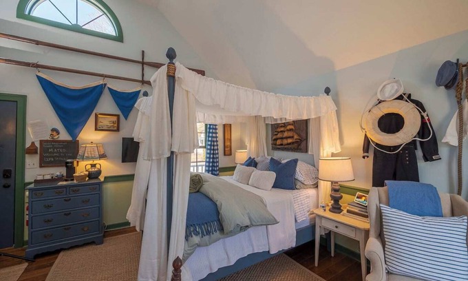The accommodations feature the enchanting Life Saver Room, complete with an en suite bathroom, cozy gas fireplace, and stunning garden views. Each room is meticulously decorated with nautical-inspired decor and hand-painted murals, enhancing the ambiance for your wedding party. Guests will enjoy high-speed internet, smart TVs, mini-fridges, and complimentary toiletries—all designed to ensure a comfortable stay. Outdoor spaces include a firepit and manicured gardens, ideal for pre-wedding events or post-ceremony celebrations.