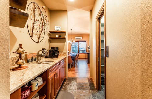 The great room features a gas fireplace and creates a cozy space to relax after a day of adventures. The large kitchen and adjoining living and dining rooms make for a wonderful space to entertain friends and family while preparing meals in a fully equipped kitchen.