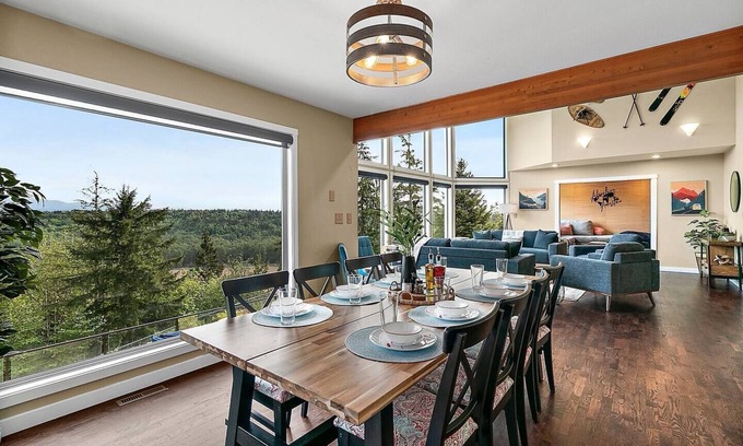 Just steps away, gather around the massive dining table that seats 10 comfortably, with two additional seats at the adjacent counter-height bar—perfect for large family meals or group celebrations. All of it is wrapped in stunning panoramic views of Mount Rainier and the sweeping Green River Valley, making every bite feel like a feast for the soul. Whether you're cooking, dining, or simply enjoying the view, this space is designed to bring people together.