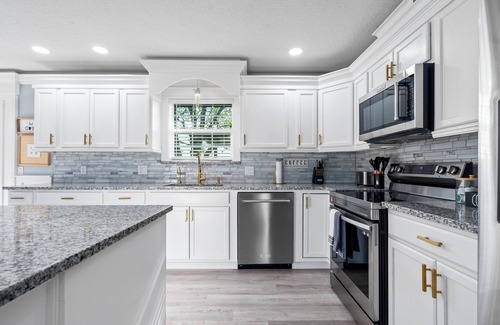 Cook, laugh, and create memories in the fully stocked, modern kitchen featuring stainless steel appliances, gorgeous countertops, and everything needed for family meals or casual snacks. Open to the living and dining areas for easy flow!