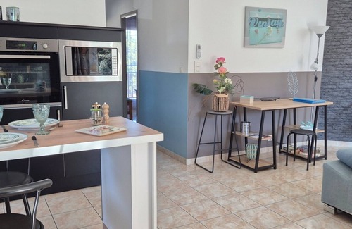 A large living room with sofa, TV. A corner office with wifi connection. A new kitchen equipped with oven, microwave, induction hob, fridge / freezer, a bathroom with shower, heated towel rail and a separate toilet. a room with a bed 160 and a dressing.