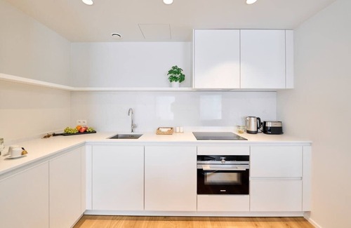 The kitchen is fully equipped with state-of-the-art appliances. It features a clean, sleek design with ample workspace to prepare meals and all the cookware and utensils you may need during your stay.
