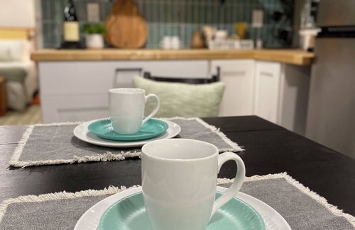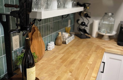 The kitchenette is stocked with countertop double cast iron burner, toaster oven, coffee maker, tea kettle, microwave, full sized refrigerator and filtered water dispenser. Coffee cups and wine glasses on open shelves with dinner and flatware housed in the cabinetry below. Cookware, cutting boards and utensils provided. Please note there isn't a sink in the kitchenette but guests have full access to the shared laundry room with deep basin sink.