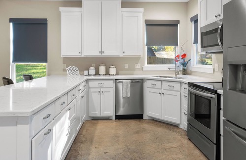 Designed with attention to detail, the barndominium comfortably sleeps up to 10 guests across three bedrooms. Main Bedroom features two double bunk beds and one queen bed, accommodating up to six guests. Two Adjacent Bedrooms, each has a queen bed and access to the front porch, the carport, and a shared full bath. Please note that one bedroom opens directly into the other, making it a great setup for families or close friends. We personally manage this property to ensure it meets our high standards for cleanliness and comfort. Guests will enjoy premium-quality white linens, towels, and essential toiletries in a spotless environment. We follow 5 steps enhanced cleaning process rigorously, rest assured!