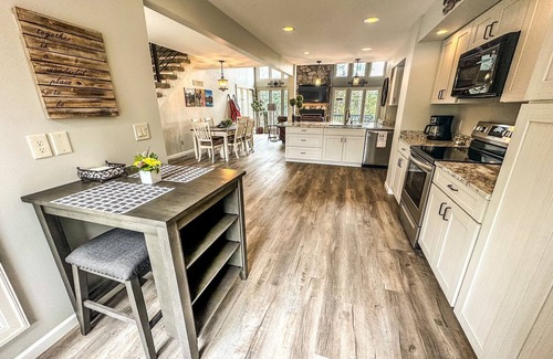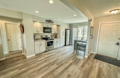 On the main floor is an open floorpan kitchen with a giant granite island seating 4 people. A dining room seating 6, two sitting areas, which looks out over the hills and a large smart TV over the fireplace make this a perfect community space to relax and unwind in-between your adventures.