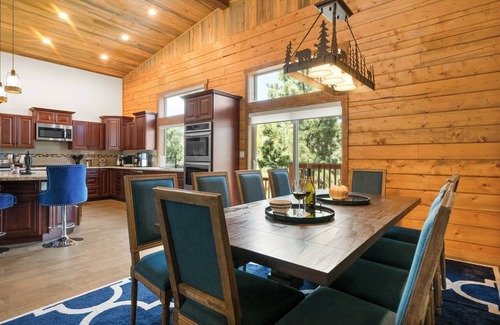 The dining area features a large, elegant dining table with seating for 10+, a perfect place for family meals, holiday gatherings, or hosting friends. The dining table is positioned just adjacent to the kitchen, which makes serving meals easy and convenient. The dining table is also strategically located to take full advantage of the panoramic forest views!