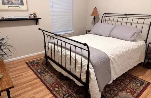 Home is in quiet, low traffic neighborhood with covered off street parking. Primary Bedroom has queen bed and its own bathroom with step-in shower. Second bedroom has Full size bed with bathroom directly across hallway. Fully supplied kitchen, comfortable Living room, bonus TV room and central HVAC.