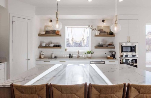 Whether you’re the family chef or planning to sample the amazing restaurants in St. George for every meal, you’ll love the modern open-concept kitchen. Seating for four around the huge marble kitchen island invites togetherness, while top-of-the-line appliances, high-end finishes, and a stunning light and bright design make time spent in the kitchen enjoyable. When it’s time to dine, the light-filled dining space is incredibly inviting with a table for eight and lots of windows.