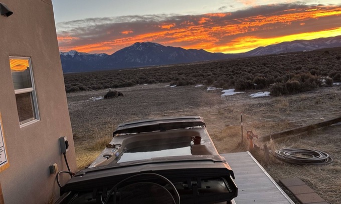 Guests are sure to enjoy a memorable vacation in this new fully furnished, 1_bedroom/_1bath _home The24x16 bedroom (upstairs) has a king size bed, full size futon(sleeps two),and a queen size Sleeps number bed. Sleeps 6 guests. Downstairs is a small kitchen/dining area, and a full size bathroom with tub/shower. Very private. no neighbors, no streetlights. Excellent stargazing. New hot tub and deck installed Dec 2023 Only a mile from Taos Mesa Brewpub(best music venue in northern NM) Only thirty minutes to world renowned Taos Ski Valley. Only a few miles to black rock hot springs . 2 1/2 acre lot.