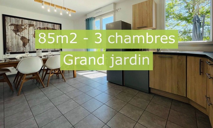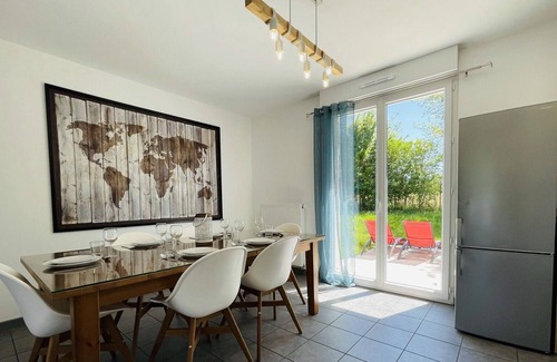 The living room also gives access, through a large glass door, to the garden of approximately 450m² where you will find everything you need to have a good time outside; table, chairs, deckchairs to enjoy the sun and of course the essential barbecue for summer or winter for the bravest.