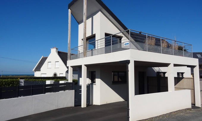 It is a new contemporary house with a well decorated with contemporary colors of 105 m2 on 2 levels with panoramic views of the bay and perrosienne 7 islands. It is located 2 steps from the beach of Royau.
