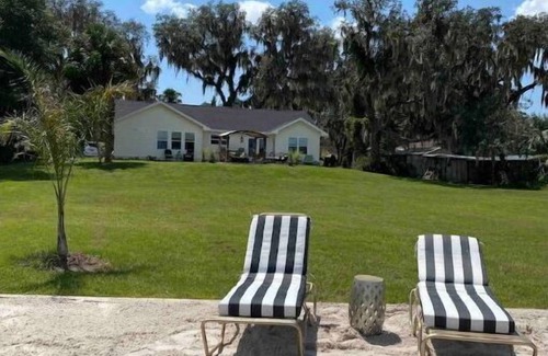 The Lake House has a Cozy coastal vibe. It’s on a quiet spring-fed Lake in Umatilla Florida. This charming home is newly built and fully furnished with up-to-date amenities and utilities. With 3 bedrooms and 2 full bathrooms, our comfortable home has room for the whole family! The Primary and Secondary bedrooms both have views overlooking the Lake with doors in each room for private entrance/exit onto the back patio. Our large furnished patio is complete with a pergola, fire pit, gas grill, and large outdoor shower with hot and cold water. The home sits on a large rolling backyard which ends at a private sandy beach and a small private dock. Two canoes and a kayak are all available for use. Relax and unwind on the lounge chairs and admire the beautiful sunrises and sunsets (which are both visible from the property's backyard) over the lake. Two fire pits for when outdoor activities and group fun continue into evenings gathered by the warm light of the fire. The property is a short bike ride to the quaint Town of Umatilla with a coffee shop, an ice cream parlor with homemade ice cream, a delicious Mexican restaurant. It's a 10-minute drive to Eustis and a 15-minute drive to the Vibrant downtown Mount Dora. Restaurants w cuisine from all over the world ! Both have amazing unique shopping and festivals all year long.We are a 15 min drive to Ocala National Forest and many of the area's most beautiful natural springs. Florida's famous East Coast beaches, New Smyrna and Daytona are 1hr and 15 drive. North Lake Community is 10 mins and The Big House athletic complex is just 25 minutes away - We are also just an hour's drive to the Disney Parks, Universal Studios, and Sea World -the house is located close enough to drive to all these places but also just far enough out of town to slow down and have a restful and recharging day. The house sits at the end of the street which ends in a culdesac, It is a very quiet and peaceful neighborhood with very little traffic - a public boat ramp and a larger dock just a quarter of a mile away from the property. Enjoy an adventurous, peaceful, and nature-filled getaway in our beautiful, newly built 3-bedroom lake house.