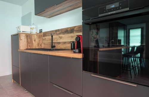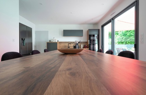 The open-plan SCHMIDT kitchen features a very large central island for 8 people, a dishwasher, a pyrolytic oven, a microwave, an induction hob, an American-style refrigerator with a freezer, a toaster, a kettle, an electric citrus press, and a Nespresso machine (capsules not included).